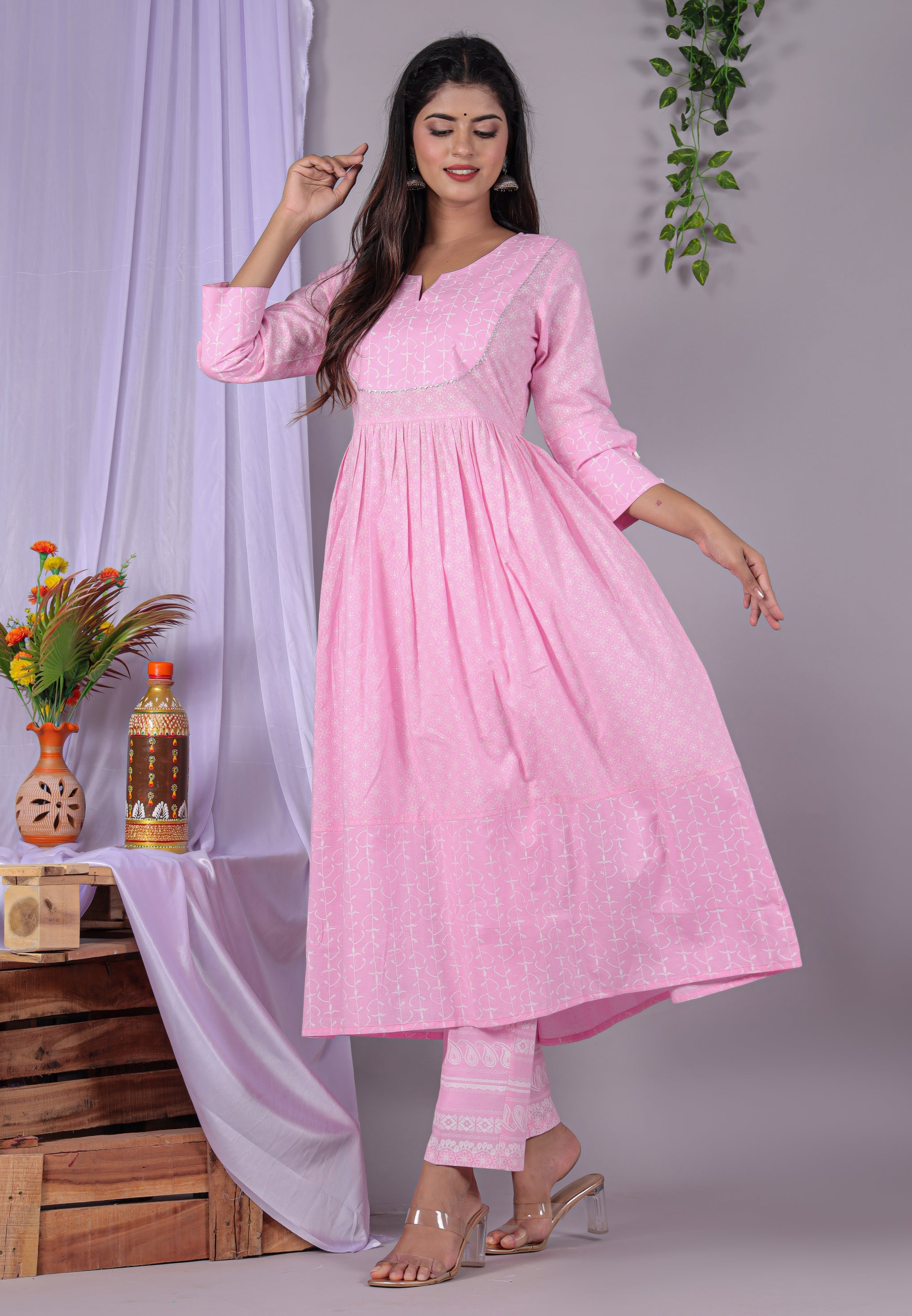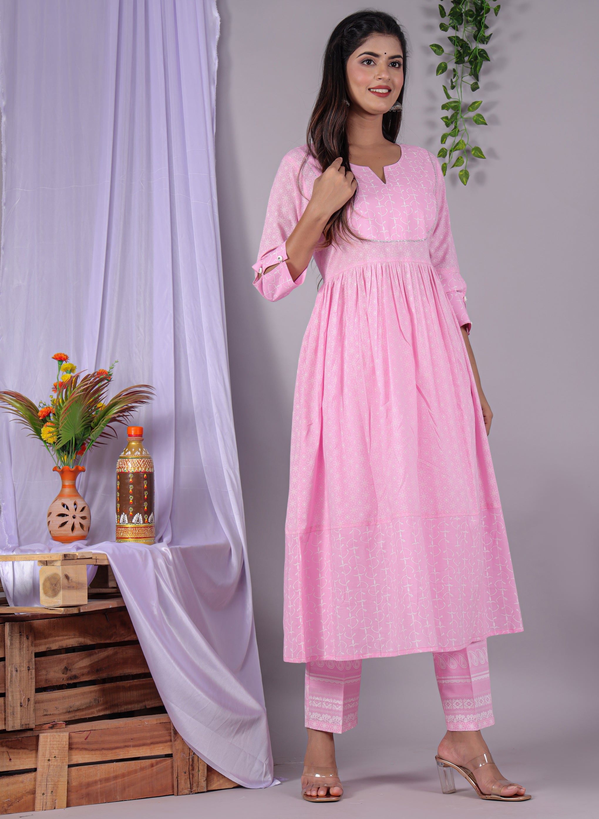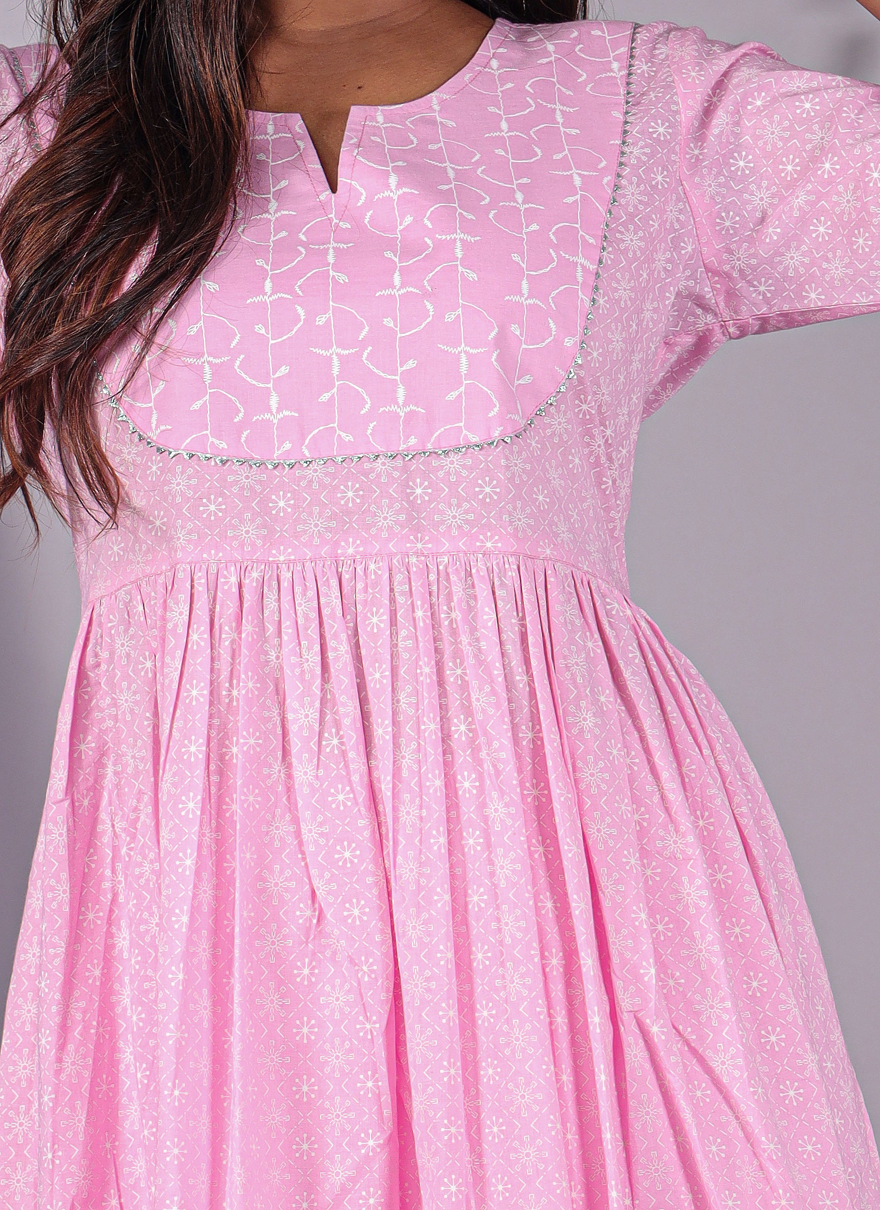 Add a touch of elegance to your ethnic wardrobe with this Women’s Printed Flared Dress in pink. Crafted from 100% cotton, this dress is soft, breathable, and perfect for all-day comfort. The calf-length dress features subtle all-over white prints, a round neckline, 3/4 sleeves, and a gathered waist that enhances the silhouette gracefully. Designed for effortless style, this flared dress offers a perfect blend of comfort and traditional charm, making it ideal for casual outings, festive occasions, or daily wear.