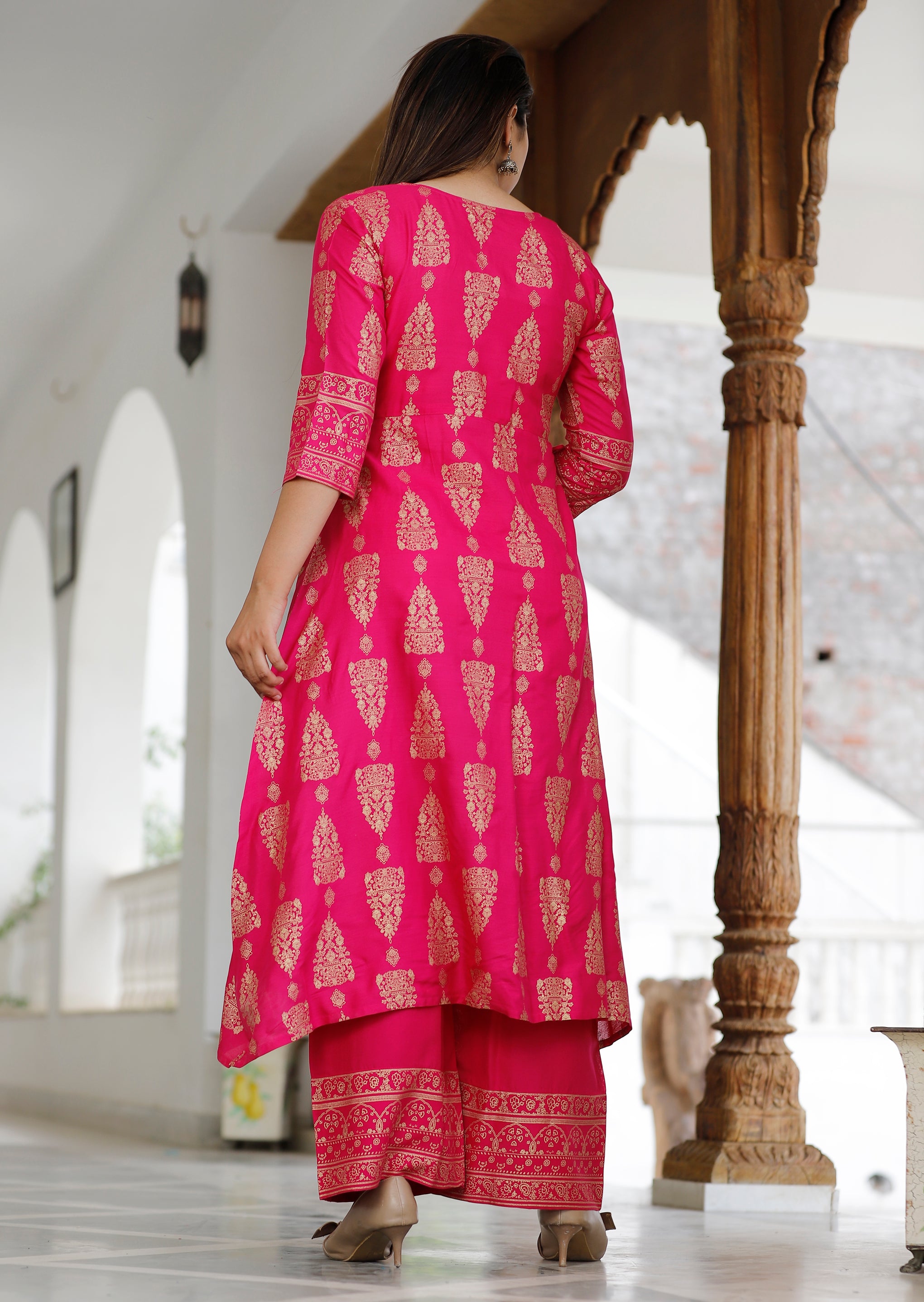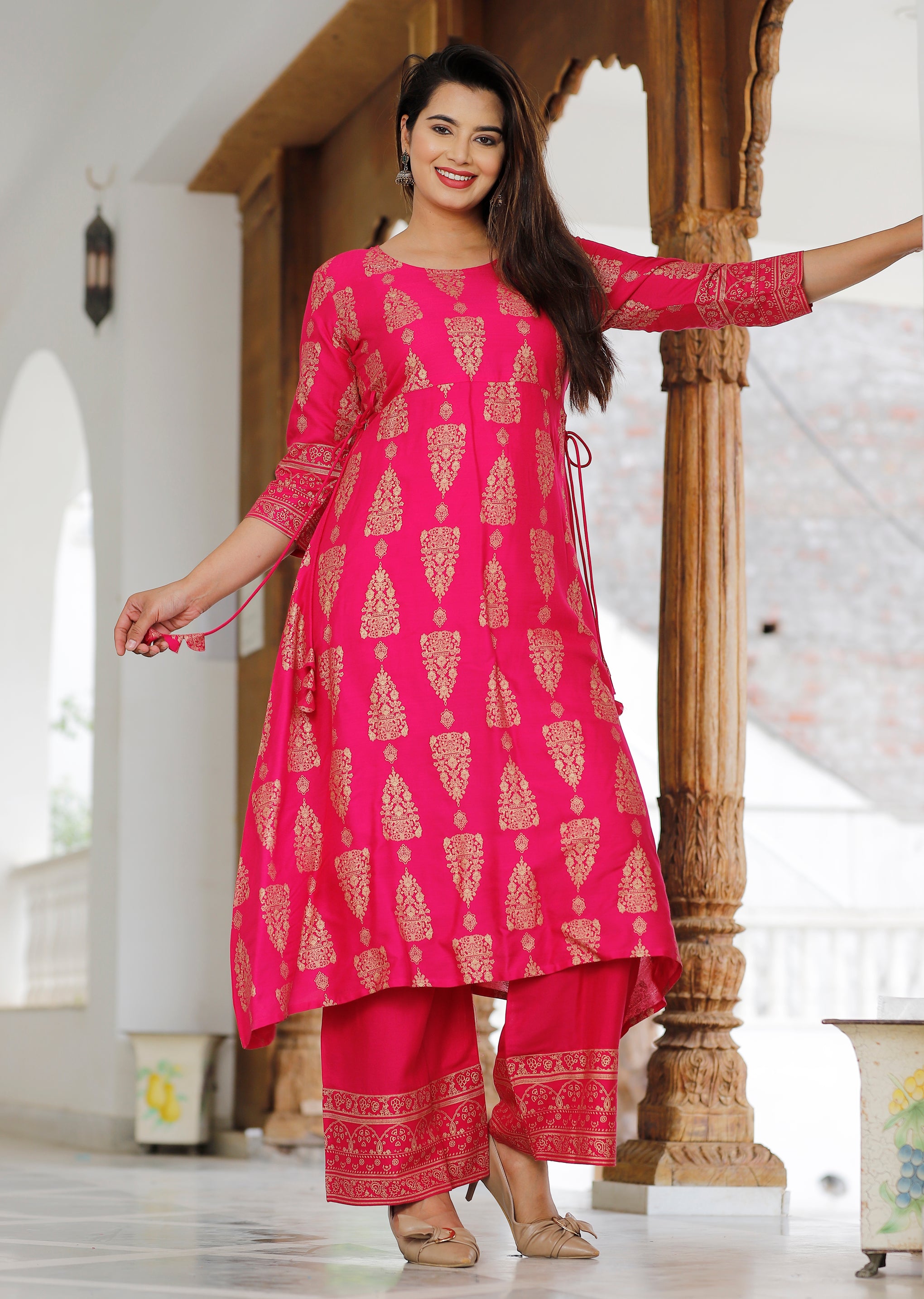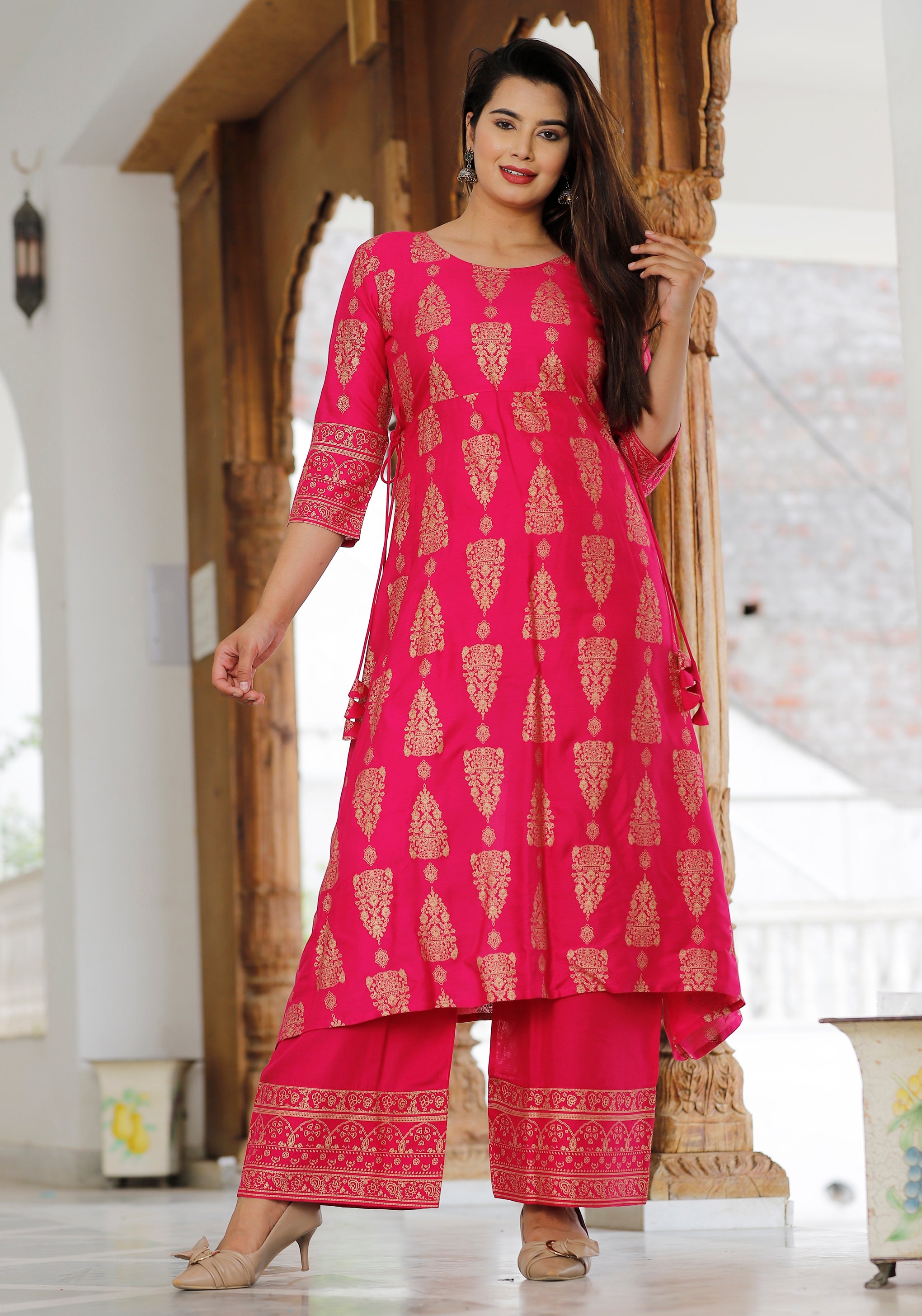 Add a refreshing touch of elegance to your ethnic wardrobe with this Women’s Pink Kurta with Palazzo Set. Crafted from soft and breathable rayon fabric, this set offers a lightweight feel and all-day comfort. The calf-length kurta features a graceful silhouette with a round neckline and 3/4 sleeves, paired with flowy palazzo pants for a chic and relaxed look. The vibrant pink shade adds charm and freshness, making this ensemble perfect for casual outings, office wear, or festive occasions.